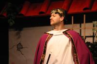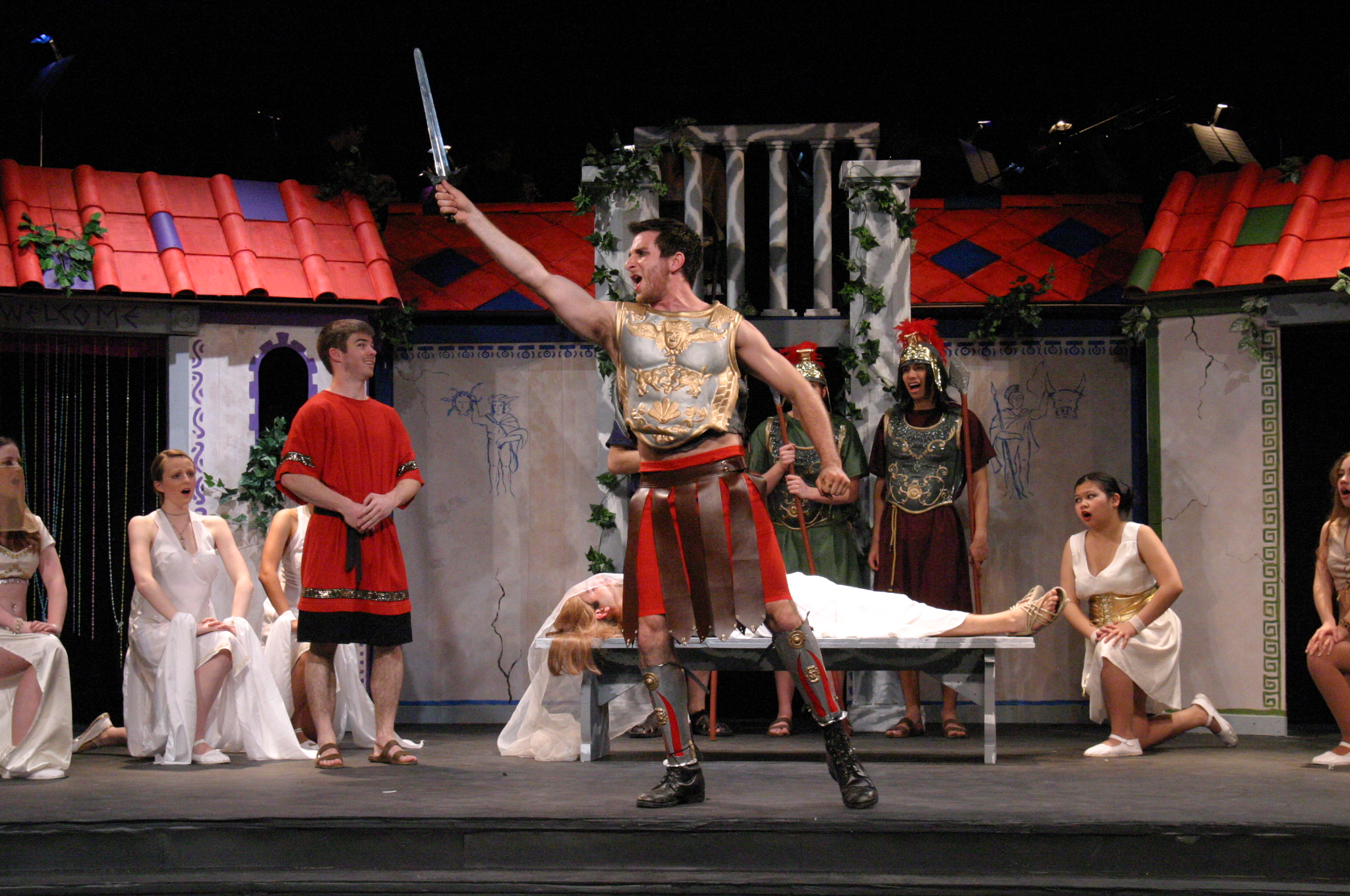 Pseudolus (Tim Abrahamsen '06) and the Proteans (Milo Martinez '08, Nicole O'Keefe '09, and Armen Babikyan) introduce us to a 'Comedy Tonight'. (credit: Jax Kirtley) Introducing Marcus Lycus (Bill Andrews '06). (credit: Jax Kirtley) Vibrata (Sarah Slotznick '09) demonstrates her assests to Marcus Lycus (Bill Andrews '06) and his staff (Milo Martinez '08, Armen Babikyan, and Nicole O'Keefe '09), Pseudolus (Tim Abrahamsen '06), and Hero (Yonatan Arie Gray '10). (credit: Jax Kirtley) Senex (Greg Lohman G), Pseudolus (Tim Abrahamsen '06), and Hysterium (Daniel Perez '10) declare that 'Everybody Ought to Have a Maid' (credit: Jax Kirtley) Soldiers (Nicole O'Keefe '09 and Armen Babikyan) show Peudolus (Tim Abrahamsen '06) the contract for Phila. (credit: Jax Kirtley) Milos Gloriousus (Misha Leybovich G) and his Soldiers (Armen Babikyan, Nicole O'Keefe '09, and Milo Martinez '08) introduce Miles Gloriousus. (credit: Jax Kirtley) Philia (Kathleen McEnnis '07) shows Hero (Yonatan Arie Gray '10) how she will get back at her captain in 'That'll Show Him'. (credit: Jax Kirtley) In the end, it is a 'Comedy Tonight'. (credit: Jax Kirtley) |