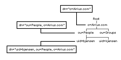 Each entry is uniquely identified by a distinguished name. A distinguished name consists of a name that uniquely identifies the entry at that hierarchical level (for example, bjensen and kjensen are different user IDs that identify different entries at the same level) and a path of names that trace the entry back to the root of the tree.