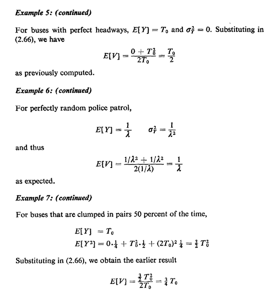 Suppose that buses along a particular route are on schedule "half the time" and "clumped" together in pairs the other half of the time. That is, for 50 percent of the day (which 50 percent is unpredictable), the bus headways are exactly T0. For the remaining 50 percent of the day, (crowded) buses arrive in pairs, the time between each pair being 2T0. Note that in this case, given paired buses, half of the bus interarrival times are 2T0 and half are 0 (!), because of zero elapsed time between two paired buses. Thus,