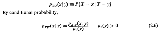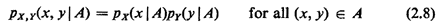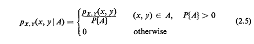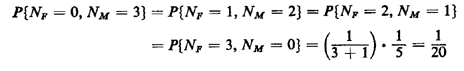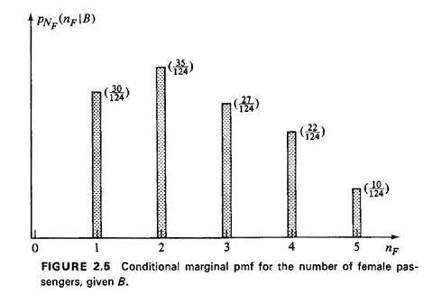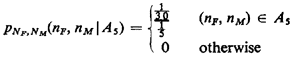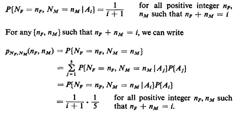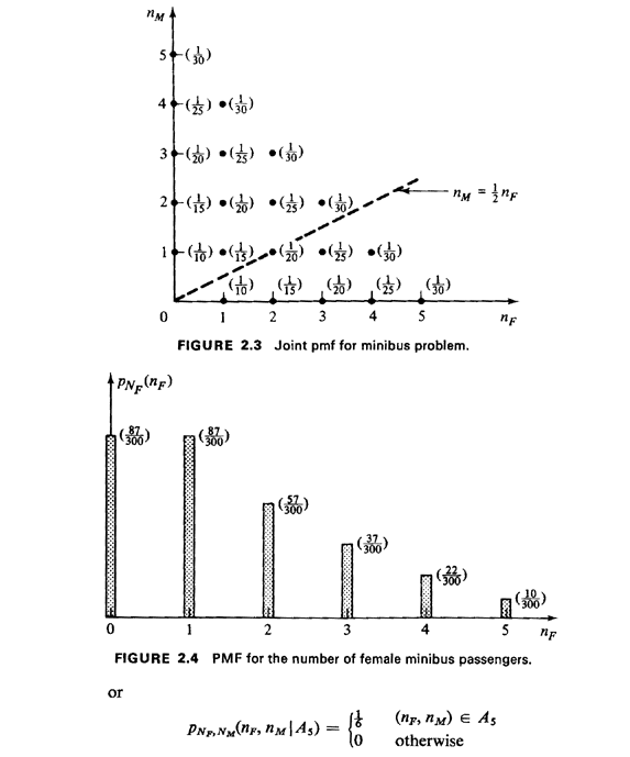 2.5 CONDITIONAL PMF'S AND INDEPENDENCESuppose we are told that an experimental outcome is contained in event A. We then wish to explore the probabilistic behavior of random variables X and Y, given A. Following the definition of conditional probability, we introduce the conditional compound pmf, ![]() If event A is stated in terms of the specific experimental value of one of the random variables of the experiment, we introduce another notation: ![]() These notations and definitions extend in an obvious way to situations with more than two random variables. Example 2: Minibus Suppose that a minibus with capacity for five passengers departs from a commuter station. Observation has shown that the bus never departs empty (with no passengers) but that each possible positive number of passengers is equally likely to be on the bus at departure time. Passengers are of two types: male and female. Given that the departing bus contains exactly n passenger (n = 1, 2,..., 5), each possible combination of male and female passenger has been found to be equally likely. a. Identify the sample space and joint probability mass function for this experiment. b. Determine the marginal pmf for the number of females on the mini bus. c. Determine the joint conditional pmf for the number of females and the number of males on the minibus, given that the bus departs at full capacity. d. Determine the conditional marginal pmf for the number of females, given that there are at least twice as many females as males on the minibus. Solution: There are two random variables in this experiment: ![]() a. A complete listing of their possible (paired) values constitutes the sample space for this experiment. These points occupy the nearly triangular region shown in Figure 2.2. The region is not perfectly triangular since the origin (NF = 0, Nm = 0) is excluded because the minibus never departs empty. The region is bounded above by the line nf + nm = 5, which expresses the capacity constraint for the minibus. To determine the joint pmf for Nf and Nm, we must use the conditional information given in the word statement. We know that any particular positive total number of passengers, ranging up to 5, is equally likely. Let Ai = event that i total passengers are on the bus We know that P{A1} = 1/5, i = 1, 2,. .., 5. Points in an event Ai lie on the line nF + nm = i, as shown for A3 in Figure 2.2. Given that an outcome of the experiment is contained in event Ai, we know that each of the points in Ai is equally likely. Since the number of points in Ai is equal to i + 1, we have ![]() ![]() This is the answer to part (a). It says, roughly, that the probability that {Nf = nf and Nm = nM} is equal to 1/5 divided by 1 plus the sum nF + nm. For i = 3, for instance, ![]() The complete joint pmf is shown in Figure 2.3. b. Once we have the joint pmf for NF and Nm, we can readily answer any question about the experiment. The marginal pmf for NF is found by invoking (2.4), which simply asks us to sum over all values of NM at each particular fixed value for NF. For instance, to obtain P{Nf = 3) = PNf(3), we sum the probabilities corresponding to the (finest-grained) events {Nf = 3, Nm = 0), {Nf = 3, Nm = 1}, and {Nf = 3, Nm = 2}, yielding 1/20 + 1/25 + 1/30 = 37/300. The complete pmf is shown in Figure 2.4. c. If we are given conditional information that the bus departs at full capacity, we know that the experimental outcome is contained in event As (i.e., nF + nm = 5). Thus, invoking (2.5), ![]() ![]() This corresponds to a straight line of probability masses, each having mass 1/6, at the integer points on the line nF + nm = 5 (nF, nm ![]() d. Let B = event that "there are at least twice as many females as males on the minibus" We want PNf(nf | B). First we work in the original joint sample space to determine finest-grained outcomes contained in the event B. Clearly, these are points nF, nm satisfying the inequality 2nm ![]() ![]() The entire conditional marginal pmf is displayed in Figure 2.5. Notice how the conditional information has shifted the pmf for NF toward greater numbers of females (compare to Figure 2.4). ![]() Just as events can be independent, so, too, can random variables be independent. Intuitively, if X and Y are independent, any information regarding the value of one tells us nothing new about the value of the other. Formally, random variables X and Y are independent if and only if PY|X(y | x) = py(y) for all possible values of x and y. Exercise 2.4: Independence of Random Variables Show that the definition of independence of X and Y implies that px|y(x|y) = px(x)and px,y(x,y) = px(x)py(y) for all possible values of x and y (2.7)Given an arbitrary number N of random variables, they are said to be mutually independent if their joint pmf factors into the product of the corresponding N marginal pmf's. Sometimes random variables may be independent but conditionally dependent; or, they may be dependent but conditionally independent. The definition of conditional independence is just what we expect: random variables X and Y are said to be conditionally independent given event A if and only if ![]() Exercise 2.5: Conditional Independence Show that for two random variables X and Y that are conditionally independent given event A, ![]() Example 2: (continued) In the minibus example, argue that Nf and Nm are not independent. Does there exist any nontrivial event A such that, given A, Nf and Nm are conditionally independent? |