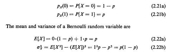 2.9.1 Bernoulli PMFA random variable X whose probability law is a Bernoulli pmf can take on only two values, 0 and 1: ![]() The z-transform is ptx(z) = (I - p) + pz. The Bernoulli pmf arises in simple trials having only two outcomes; it is also useful in the analysis of setindicator random variables (see Section 3.3). As an example of the use of a Bernoulli pmf, consider a police car performing "random" patrol. Each hour (on the hour) the patrol officer spins a wheel of fortune on the car's dashboard to see if the car should patrol a specially designated "high-crime zone" during the next hour. If police crime analysts have determined that approximately 25 percent of the time on random patrol should be spent in this zone, then an angle equal to ![]() |