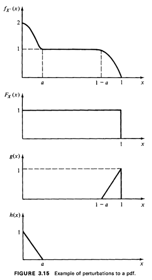 3.2.2 Perturbations to a PDFSometimes use of perturbation ideas may help us to approximate a complicated pdf in terms of simpler quantities. Suppose thatfx'(x) is the pdf of interest. Write![]() where ![]() Here fx(x) is the "simpler" pdf ; h(x) is an added and g(x) a subtracted perturbation term. The perturbation functions, when normalized by P ![]() ![]() ![]() ![]() Example 7: Triangle Pertarbations Consider the example illustrated in Figure 3.15. The "complicated" pdf fx'(x) may be approximated as the sum of a uniform pdf and a triangular function h(x), with the triangular function g(x) subtracted from the sum. From previous work we know the following: ![]() ![]() |