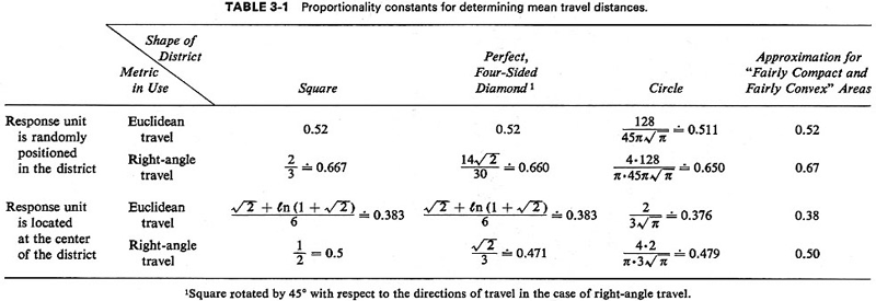 where A0,, is the area of the district and c is a constant that depends only on the metric in use and on the assumption regarding the location of the response unit in the district.