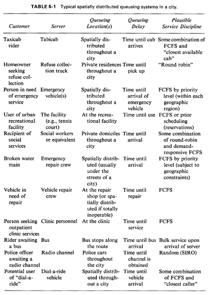 5.1 SERVER-TO-CUSTOMER SYSTEMSAs seen in Chapter 4, the number of queueing models (even with indistinguishable servers) is enormous. Each apparently minor change in assumptions can bring about a host of new analytical problems, thus requiring new analysis. This problem is much more severe in a spatial setting where the spatial distribution of servers and/or customers adds to the already nearly limitless number of possible system configurations and operating rules. Thus, we are motivated to choose a representative class of urban spatial queueing systems to illustrate the methods and approaches involved in a spatial setting. In selecting a class of models our objectives are fivefold: To demonstrate the linkage between the geometrical probability concepts of Chapter 3 and the queueing concepts of Chapter 4. To maintain analytical tractability, at least for small numbers of servers. To illustrate how a complicated urban environment can be modeled in a queueing framework and analyzed numerically on the computer. To illustrate the derivation of simple rules of thumb, based on "back of-the-envelope" calculations. To select a model that has been used in cities to affect policy decisions. Fortunately, all of these objectives can be satisfied by selecting from the class of "demand-responsive" queueing systems that operate as follows: Requests for service (customers) are generated as a Poisson process in time from throughout the city or part of the city. In response to each request, either