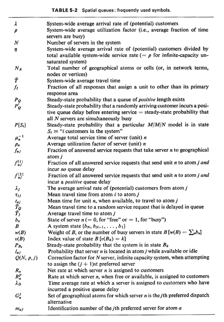 The first type of system, called a server-to-customer system, could be an emergency service system, for instance police, fire, ambulance, or emergency repair; a social service system involving demand-responsive home visits, for instance by a social worker, physician, or practical nurse; or a demandresponsive delivery system, delivering for instance parcels, pizzas, or parts for automobiles. The second type of system, called a customer-to-server system, could correspond to outpatient clinics, police precinct stations, little city halls," libraries, and so on. Typically, the geometrical considerations are quite similar for the two types of systems, but their queueing characteristics are not. In both types of system, server proximity plays a key role, typically with the closest server being the one utilized. However, in the server-to-customer system, the fact that the first preferred (usually closest) server is busy does not necessarily imply a queueing delay for the customer; instead, server cooperation or workload sharing would usually result in the assignment of a nearby backup server. Thus, customers can have the dual benefits of a "neighborhood" server for most service requests and the small queueing delays associated with multiserver queues due to workload sharing. In the customer-to-server system, the customer is not likely to travel to the second or third closest service facility, even if such a policy would reduce the total time until service; this is due primarily to a lack of real-time knowledge of the queueing situation at each facility plus the fact that many neighborhood service systems allow use of only one service center (i.e., no planned workload sharing). Because of the "standard" operating behavior of the customer-to-server system, most of the queueing techniques of Chapter 4 apply directly, perhaps modified due to geometrical considerations. However, the workload sharing nature of server-to-customer systems make them particularly attractive to study-and this will be our choice in this chapter. Most of the models we will examine will require further assumptions, which limit their applicability across the class of server-to-customer systems. Our tour of server-to-customer queueing models proceeds from singleserver models (applying the theory of M / G / 1 queues); to simple two-server models. in which closed-form expressions can be obtained; to N-server models that may be analytically tractable or, more likely, require computer solution; to "infinite" or many-server models. We will find that this selection of models will fulfill each of our five objectives for the chapter. Several of the known extensions to this work are developed as problems at the end of the chapter. Given the vast number of urban problems that can be usefully approached from a queueing theory point of view, the results to date represent just a beginning. We expect this area of applied queueing theory to be a fertile one for research in the years ahead. For convenience, symbols frequently used in this chapter are collected together in Table 5-2. |