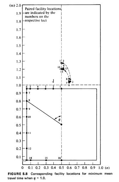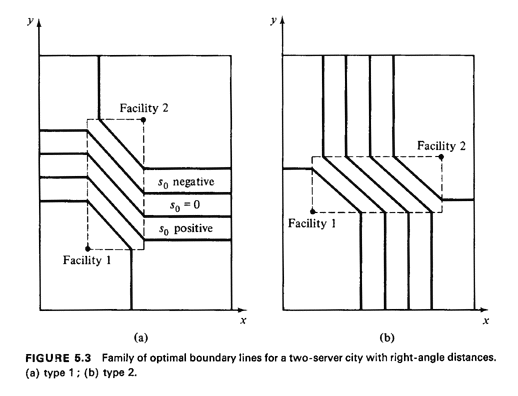 5.3.5 Facility LocationLarson and Stevenson, in work concurrent with that of Carter, Chaiken, and Ignall, used a particular form of the two-server model to examine certain questions of optimal facility location [LARS 72]. In particular, they considered an n x m rectangular region in which service requests are uniformly distributed and in which facility 1 is located at (x1, y1). One is free to position facility 2 at any location (x2,y2) and to construct optimal response areas. This situation might correspond to one in which an existing facility serving the region is overburdened and a second facility is about to be introduced. The problem is to locate the second facility and to partition the region so that the resulting mean travel time is minimized. A similar type of problem in a network context is related to the "p-median" problem (see Chapter 6). Travel time is assumed to be right-angle, with directions of travel parallel to the sides of the rectangle. As one varies so a first question involves the change of the candidate boundary lines. Applying the Carter-Chaiken-lgnall result in this case, an optimal boundary consists of points (x, y) satisfying an equation of the form where (x1, y1 ) and (x2, y2 ) are the respective facility coordinates. Equation (5.19) generates the family of boundaries, either type 1 or type 2, illustrated in Figure 5.3. For any given (x1, y1 ) and(x2, y2 ), it turns out there will be two values for so which do not yield unique boundaries but rather regions in which all points are so closer to one facility than to another. Any line partitioning B and contained in such a region is an optimal boundary. The system's mean travel time, while containing many terms, can be found almost by inspection by repeated application of the ideas in Sections 3.4.1 and 3.8, linking pdf's to geometric designs of service regions. For instance, for a very low utilization system, in which the frequency of interresponse area dispatches is negligibly small, the optimal boundary is the equal-travel-time boundary (i.e., so = 0). For this case, suppose that facility 2 is located north to northeast of facility 1: ![]() y2 ![]() y2 - y1 ![]() yielding a type 1 boundary (see Figure 5.3). Then, by repeated conditioning on rectangular and triangular subregions one obtains, for the mean systemwide travel time, For each of the other seven possibilities for the relative placement