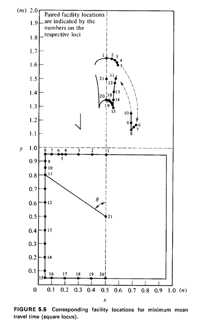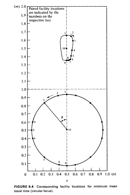 of facilities, the expressions for For the case of To indicate the qualitative properties of the results, we discuss as an example a region for which n = 1, m = 2. We continuously vary the position of facility 1 over a closed trajectory in the southern half of the region. We then examine the locus of optimal positions of facility 2 induced by varying facility 1 over the fixed trajectory. In Figure 5.4 we see the effect of varying the position of facility 1 over a circular trajectory centered at (0.5, 0.5) and having radius 0.45. The most striking feature of Figure 5.4 is that for large changes in the position offacility 1, the change in the position of facility 2 to maintain optimality is relatively small. On occasion, a continuous trajectory of facility 1 locations induces a discontinuous trajectory of optimal facility 2 locations, the discontinuities occurring at points where the optimal boundary configuration changes, say, from type 1 to type 2. The mean travel time is found to be continuous, however. This effect is seen clearly in Figure 5.5, in which the position of facility 1 is varied over a square centered at (0.5, 0.5) of dimension 0.9, yielding a dis continuous trajectory of optimal facility 2 locations. We see that, for facility 1 near the top corners of the square, the optimal location of facility 2 jumps to a region in which a type 2 (rather than a type 1) boundary is required. Corresponding to the two trajectories for facility 1 in Figure 5.4