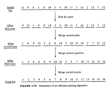 7.2.1 Efficient Sorting and SearchingIn simulating urban systems it is often necessary to sort long arrays of numbers such as the coordinates of incidents, the addresses of mail recipients, or the times at which requests for service occurred. Equally important, sorting algorithms play a central role as "building blocks" in techniques aimed at resolving several important geometrical problems, as we shall see shortly. It is therefore important to develop a sorting algorithm that is as efficient as possible. Suppose that we are given n integers and that we wish to sort them in,