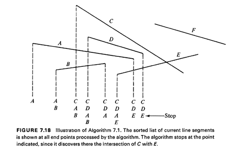 What is the computational complexity of Algorithm 7.1 ? Step 1 requires O(n log2 n) time for sorting the 2n end points. [It actually requires 0(2n log 2n), but remember that in the theory of computational complexity 0(2n) is equivalent to O(n).] The addition (or deletion) of line segments to (or from) the sorted list of current line segments in Step 2 requires O(log2 n) time, since the sorted list can contain at most n line segments at any time. Checking whether two line segments intersect requires constant time (i.e., is independent of n). Since in the worse case, when there is no intersection, Step 2 must be repeated 2n times, Step 2 also consumes a total time which is O(n log2 n). Noting that Step 3 is trivial and will be repeated 2n times in the worst case, we thus conclude that Algorithm 7.1 is O(n log2 n), as suggested initially.