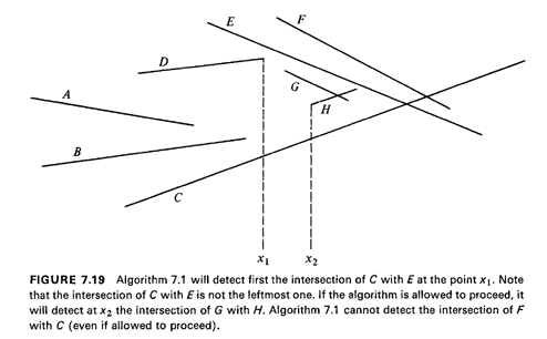 To prove that this algorithm works, (i.e., that it finds an intersection if there is at least one), it is sufficient to show (see Problem 7.5) that if the algorithm is not stopped when it finds its first intersection, it is guaranteed to find eventually the leftmost intersection of the line segments. This statement emphasizes the fact that the first intersection discovered by Algorithm 7.1 is not necessarily the leftmost intersection. This peculiarity is illustrated in Figure 7.19. Another peculiarity of Algorithm 7.1 is that, if allowed to process all end points, it may "miss" some intersections (see again Figure 7.19), although, as we just stated, it will never miss the leftmost one.