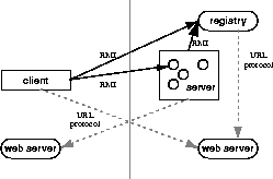 The illustration below depicts an RMI distributed application that uses the registry to obtain references to a remote object. The server calls the registry to associate a name with a remote object. The client looks up the remote object by its name in the server's registry and then invokes a method on it. The illustration also shows that the RMI system uses an existing web server to load Java class bytecodes, from server to client and from client to server, for objects when needed. RMI can load class bytecodes using any URL protocol (e.g., HTTP, FTP, file, etc.) that is supported by the Java system.