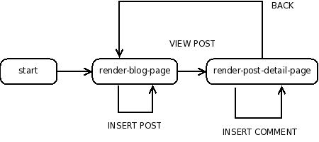 ; render-blog-page: blog request -> doesn't return ; Sends an HTML page of the content of the ; blog. (define (render-blog-page a-blog request) (define (response-generator embed/url) (response/xexpr `(html (head (title "My Blog")) (body (h1 "My Blog") ,(render-posts a-blog embed/url) (form ([action ,(embed/url insert-post-handler)]) ,@(formlet-display new-post-formlet) (input ([type "submit"]))))))) (define (insert-post-handler request) (define-values (title body) (formlet-process new-post-formlet request)) (blog-insert-post! a-blog title body) (render-blog-page a-blog (redirect/get))) (send/suspend/dispatch response-generator))