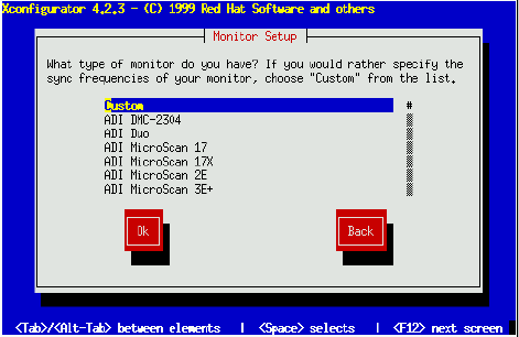 First, Xconfigurator presents a list of monitors (Figure 8-42). If your monitor is listed, select it and press Enter. Otherwise, select Custom.