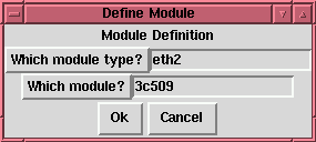 If there is more than one module which can be used for the module type you have chosen, you will be presented with a dialog box (Figure 3-38) which asks which module you want to use, and may also ask for specifics about the type of module; for ethernet, for example, you need to choose from eth0, eth1, etc. When you are done, click Ok again to continue to specify any module options in the next dialog box (Figure 3-38), which is the same as the dialog for editing a module.