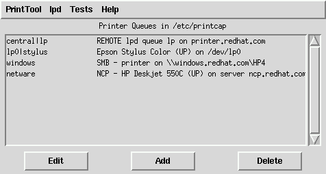 In order to create a new print queue, choose Add. Then, select what type of printer is being added. There are four types of print queues which can be configured with printtool: