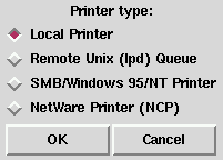 Please Note: If you require a username and password for an SMB (LAN Manager) or NCP (NetWare) print queue, they are stored unencrypted in a local script. Thus, it is possible for another person to learn the username and password. It is therefore recommended that the username and password for use of the printer to be different than that for a user account on the local Red Hat Linux system, so that the only possible security compromise would be unauthorized use of the printer. If there are file shares from the SMB server, it is recommended that they also use a different password than the one for the print queue.