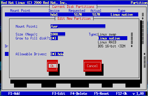 To add a new partition, select the Add button and press Space or Enter. The Edit New Partition dialog (Figure 10-16) appears.