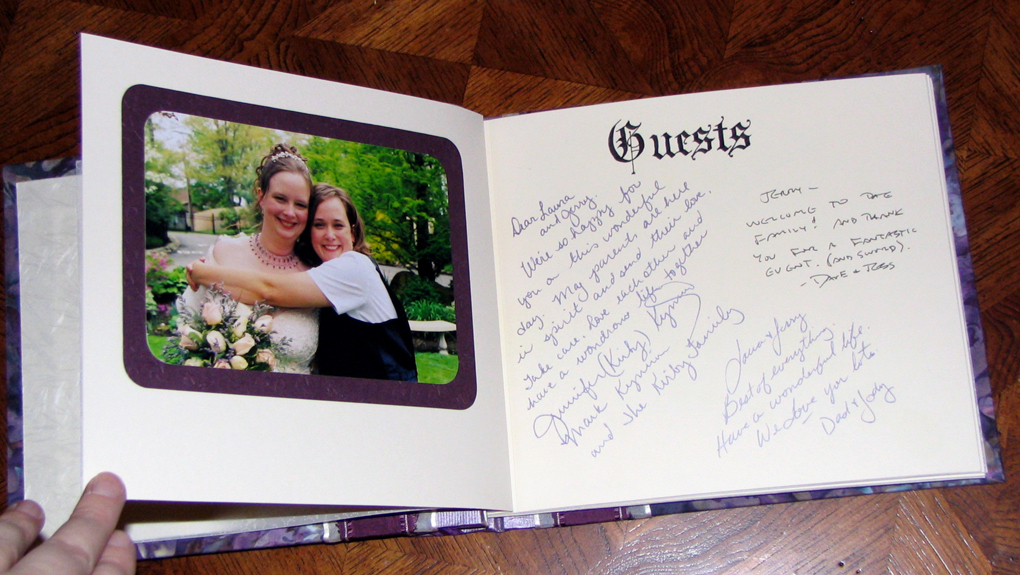 Jess & Dave signed the first page, so I figured opposite it was the perfect place for this great shot of Laura & her sister. (Did this picture really come from a disposable camera? Wow! The difference a nice overcast day will make!) |