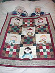 Quickly throwing up a brief progress report: Here's an image of 1/6 of the main quilt, sans children. The picture is not great; my sewing is crooked, but not that crooked. The colors are slightly off too. The pillow background came from Susie -- from an old pillow case no less. The striped blanket edge is from my old, favorite nightshirt that (alas) ripped at Deep Creek some years back and has since been turned into little nightshirts for Mira and Alexander (who may grace the quilt as the little blond children). |