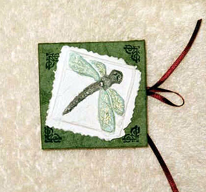 Color shipping tag with marker #993. Stamp with SA crackle block. Stamp Italian Tarot card on white/cream card stock. Color dress with #847, shield and staff with #993. Glue to dark red paper. Glue to shipping tag. Add fibers and beads.