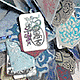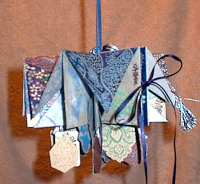 My practice run to determine how hard this is. As you can see, getting it to hang straight requires care. Perhaps more tags on the next one. I put more work into the practice than I meant to, heh. [As ever, pictures are not great because I lack either a scanner or a digital camera; the camera a borrowed is old and I can't get ever seem to get it to focus on small things.]