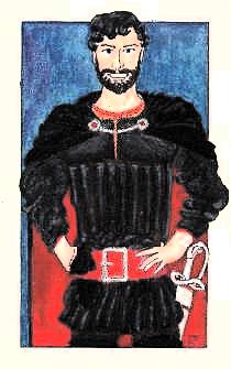 A tall handsome man, with hair so black as to be almost blue. His beard curls around his smiling mouth, and he is dressed simply in a leather jacket, a plain cloak, and high black boots. He wears a a red sword belt clasped with a ruby from which hangs a long silvery saber, and his high cloak collar is line with red, matching the trim on his sleeves.