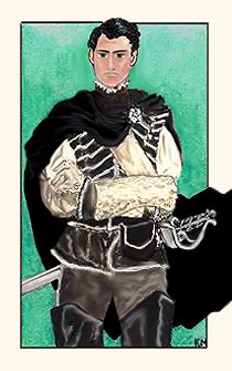 A man dressed in black and silver, with black hair and an intense look in his green eyes. His cloak is furled slightly by the wind. A heavy blade hangs at his side; he wears silver scaled gloves and a silver rose clasp at his neck.