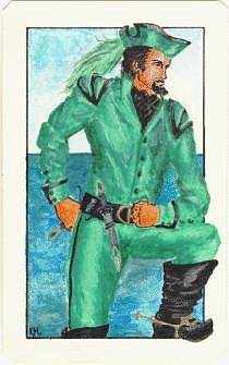 A swarthy, dark-eyed man, dressed all in green and black satin, wearing a dark three-cornered hat set a a rakish angle, a green plume of feathers trailing down the back. He stands in profile, one arm akimbo. the toes of his boots curl upwards and he wears an emerald studded dagger at his belt.