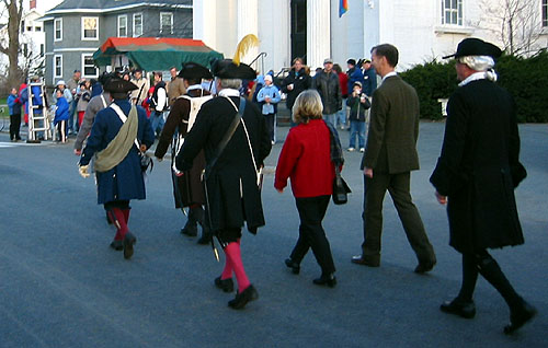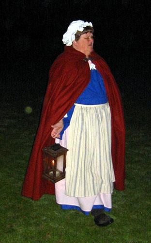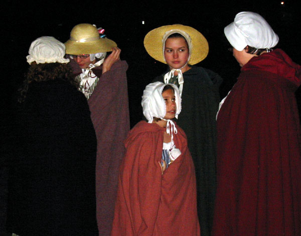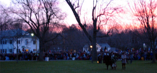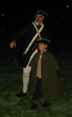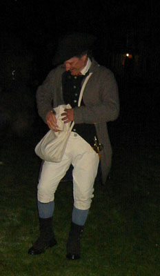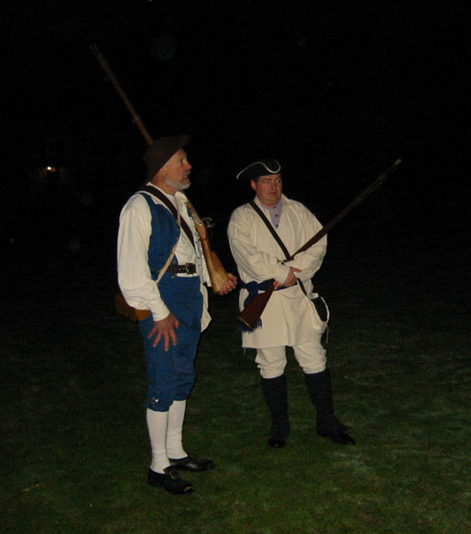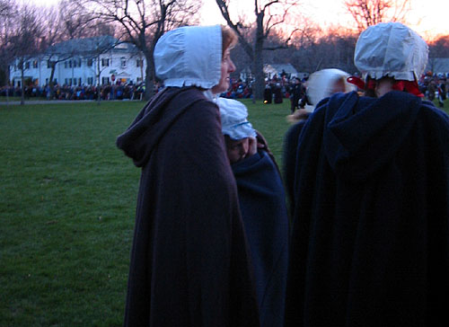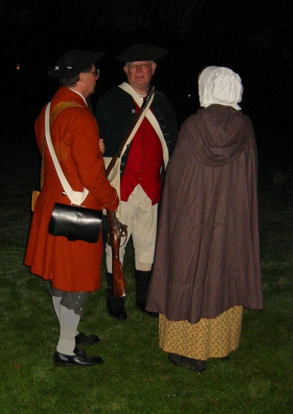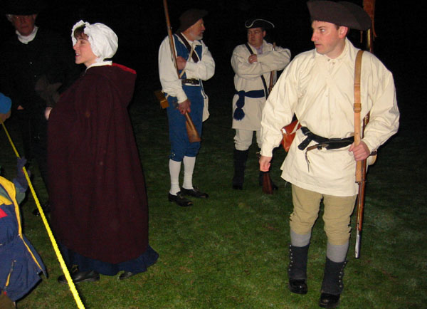 Having acquired an excellent viewing spot, we settled down to wait the 45 minutes or so in the cold and dark until things started happening. During this period of time some of the townspeople and minutemen spent time milling around the common in small groups. When we first got there, we saw a couple minutemen wander by asking if thre were pickeys yet. Gradually more people appeared, including women carrying candle lanterns. One minueman in green kept wandering and telling people "Don't worry the heat will be one soon." At this point, Captain Parker and some of the militia are waiting across the green in Buckman's Tavern for word from their scouts of the impending arrival of the British. At this point, it's still pretty dark and kind of cold. Wiser spectators had brought blankets and chairs. And hot drinks. The only way I could frame pictures on my digital camera was by observing where my subjects were in relation to the electric lights, which were the only things that showed up on my viewfinder.