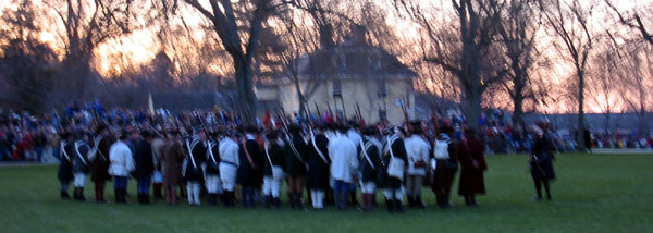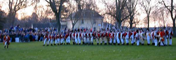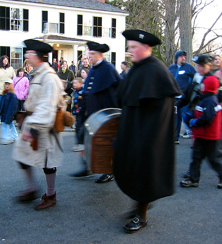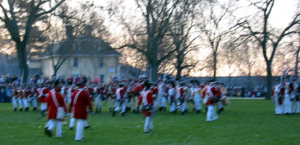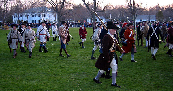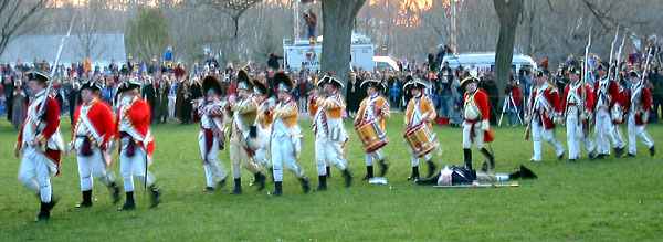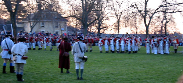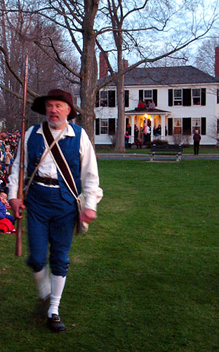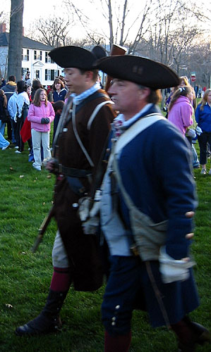 Thaddeus Bowman rides in warning that the Regulars are near. The minutemen begin to assemble on the green. The minutemen form up in two lines to wait. (At this point, they march a little in formation to fife music. [video]) Paul Revere and John Lowell run into Buckman's tavern and retrieve Hancock's trunk of secret papers and run back across the green and into the woods with it. [video] (Read more about Paul Revere, including the trunk incident.) The minutemen wait. Soon the sounds of the British marching music can be heard in the distance.