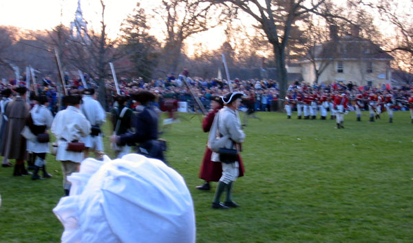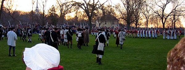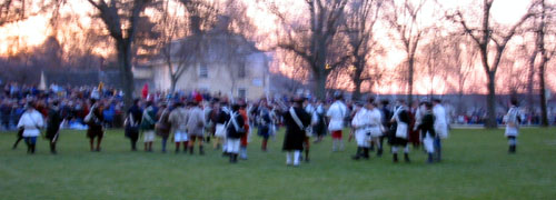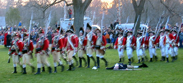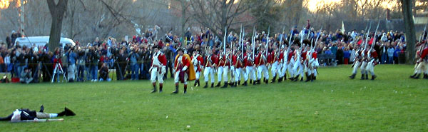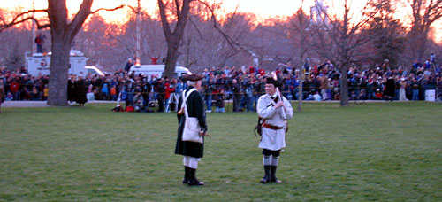 Eventually we can see as well as hear the British marching up Mass Ave. with a police escort. They run the last little way up onto the green and form ranks. Captain Parker tells his men. "Stand your ground. Don't fire unless fired upon. But if they mean to have a war let it began here." (We couldn't hear this from where we were.) Major John Pitcairn, the British officer commanding these 6 companies, and two of other British Officers approach the minure man and yell, "Lay down your arms! You rebels disperse. Damn you disperse!" (This we heard some of.) The minutemen start looking nervous. The British officers return and the lines of British start yelling taunts at the militia. One colonials breaks and runs. (The audience laughs.) Several of the men in the back start backing up. The British fix bayonets and start marching forward.