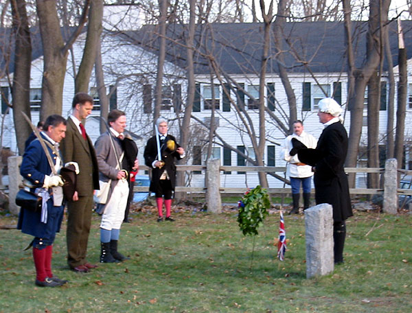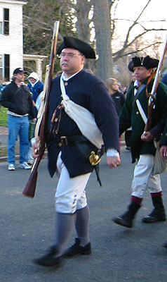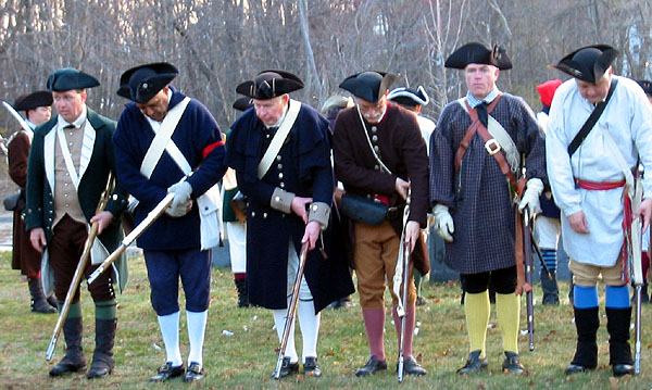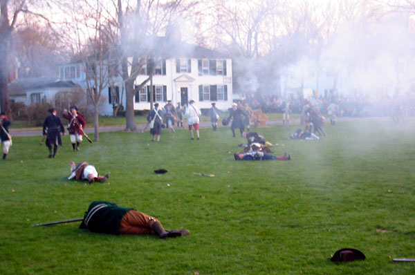 Afterward the battle the minutemen reformed on the green. The reenactors also reform, listen as the names of the eight men who died are read, and march off to the graveyard to fire a few volleys to honor the fallen.