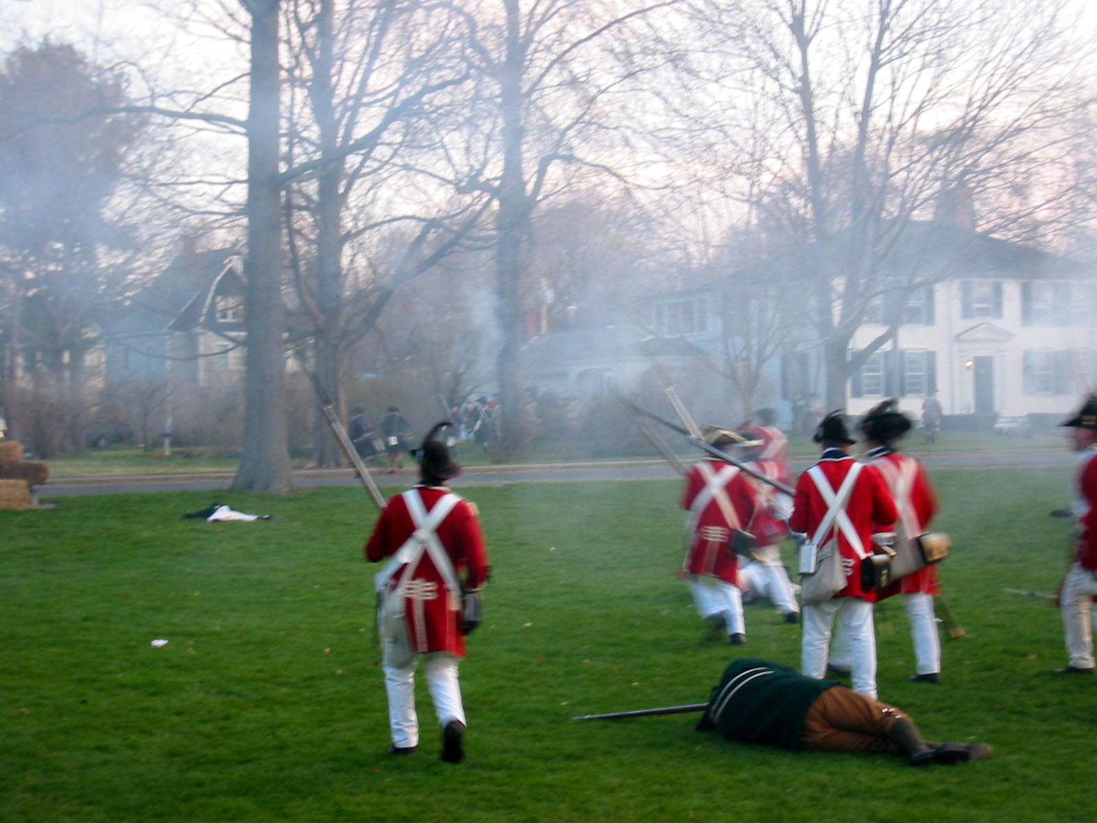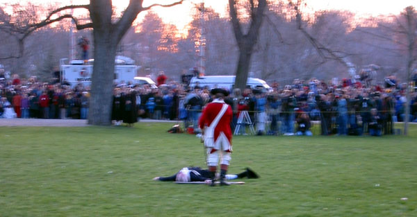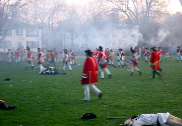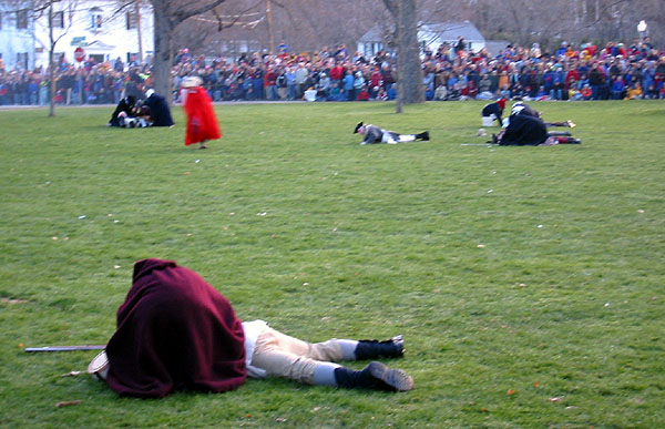 Having regained control of their men, the British officers reform them on the green and scold them for a little while. The women rush in from the sidelines to see to the fallen. Formed up and scolded, they fire another volley in unison, causing the women to flee screaming back to the sidelines. [video] That done, they give three cheers for King George and start marching off by company towards Concord.