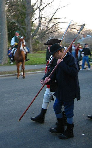 I resolved that this was the year I was going to see the reenactment of the Battle of Lexington (aka "the skirmish on the Green" or "the shot heard 'round the world") and duly recruited Derrick, Mike, and Derrick's car (a crucial element of the plan). Armed with cameras an instructions to "just head out Mass. Ave." we left Somerville at 4:15 am (slightly later than planned, because someone forgot to turn on her alarm after setting it to 3:30 am -- whoops!) We arrived in Lexington well before 5 am though, since no one outside of Lexington appears to be up at that hour. We located parking without too much difficulty ("Okay, so the key is to arrive early enough to park in the Stop and Shop lot." -Derrick) and began wandering around trying to find the best place to watch from. Due to a merging together of memories of previous trips to Lexington and Concord, we almost went too far. Happily, we stopped to ask a friendly minuteman and he not only set us straight, but gave us three tickets to the special "Family Viewing Area." We wound up front row seats. (Wow!) When we saw him later, he was wearing a sword, giving orders, and leading one of the groups around, so we figured he must have been one of the officers. (I don't think he was Captain John Parker; I'm pretty sure he was in blue.) Sadly, I didn't manage to get a very good picture of our friendly minuteman. That's him on the right. -->