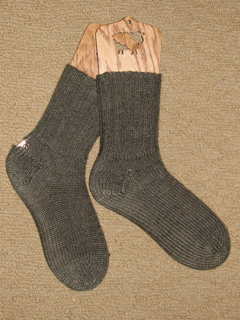 Pair Four -- Made from leftoer sweater yarn. Very warm, but handwash only. (Oops) Nevertheless, they have gotten enough wearing to sprout a hole.
