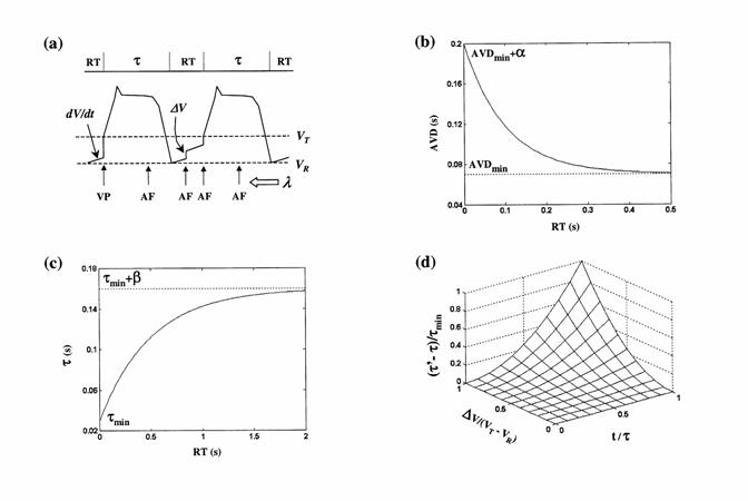 where AVDmin is the minimum AV delay when RT ® µ, a is the maximum extension of the AV delay when RT = 0, and tc is the conduction-curve time constant [20]-[23]. The antegrade and retrograde AV delays may share the same set of parameters (as in the present study), or these parameters may be independently adjusted for bi-directional AV delays. Fig. 2(b) illustrates the recovery-dependency of the AV delay.