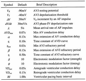 Table I summarizes the basic set of programmable parameters that are used in the present model. The default values of these parameters are also listed unless otherwise specified in the text. As shown in [19], the first four model parameters listed in Table I actually have only two degrees of freedom, specified by the relative amplitude of the AF impulses, DV/(VT - VR), and the relative rate of the AVJ phase-IV depolarization, (dV/dt)/(VT - VR).