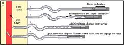 | Mechanical Needle Clutch - 2009 Current methods of trocar and needle placement into hollow organs rely on a high degree of clinical skill to stop inside the organ and not over penetrate. To address this, a purely mechanical clutch was developed which comprises buckled filament inside an S-shaped tube (the trocar or needle). When pushed against firm tissue the filament buckles and locks within the tube, causing the filament and tube to advance as one. When the needle reaches the target tissue or fluid-filled cavity, the filament unlocks and slides freely into the target region while the tube remains stationary. PNAS Paper |
