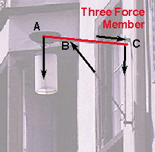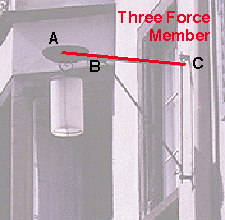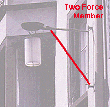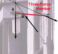 Let us examine the simple system shown. It is a simplification of the lamp indicated. The load at point F is the hanging lamp. All of the joints are considered to be pinned. If member BC is isolated, it can be seen that it has forces acting at only points C and B. This means that it is a two-force member. The line of action of the force at point C must also pass through point B; similarly, a force at point B must also pass through point C. If the force at B did not pass through point C (B' in the diagram), the force would cause a moment about point C and equilibrium would not be possible. Because the two forces are equal in magnitude, co-linear and opposite in sense, two-force members act only in pure tension or pure compression. Supports such as cables tend to work well as two force members.