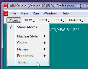 - Show the interactive "Atoms Table" for cyclopropanone.sumviz by selecting "Atoms->Table". In the Atoms Table, click on the atomic charges header "q(A)"