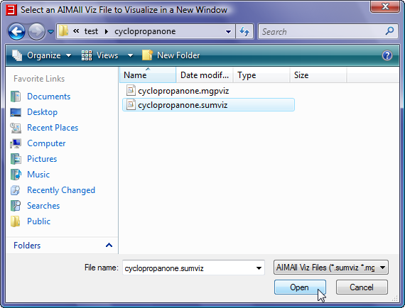 - In the AIMQB Dialog, click the "Browse" button, navigate to the folder C:\AIMAll\test\cylcopropanone (on Mac OS X or Linux the directory would be, for example, ~/AIMAll/test/cyclopropanone) and select the cyclopropanone.wfn file.