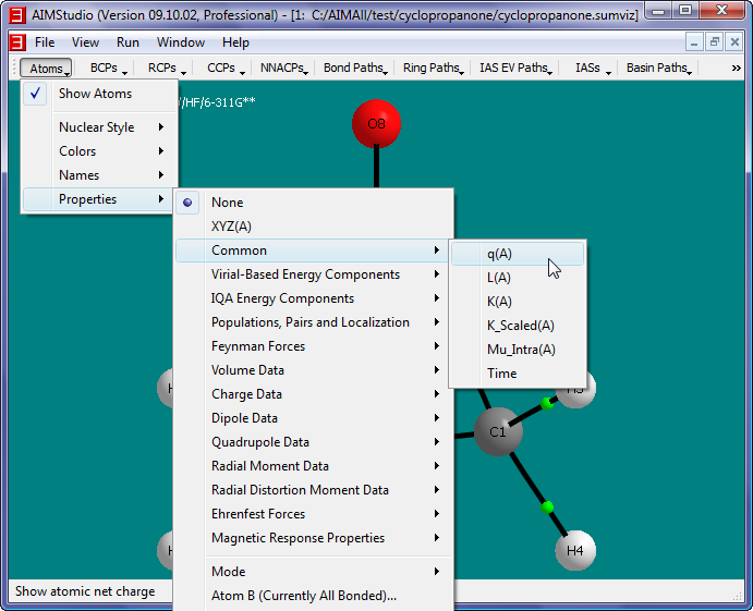 - Show the atomic charges q(A) in the window by checking the menu item "Atoms->Properties->Common->q(A)".