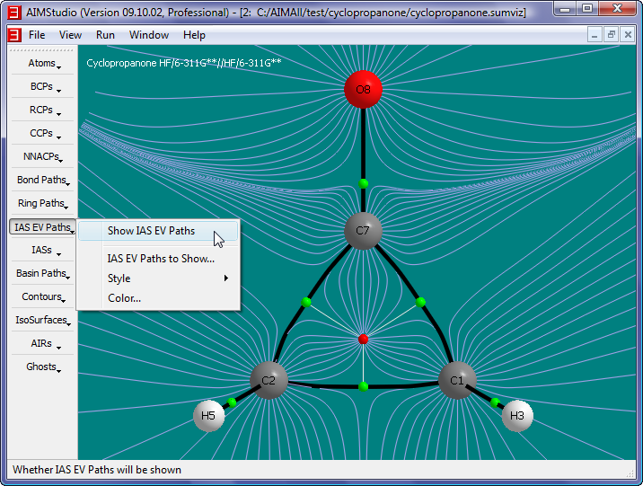 - It is desirable to also show the interatomic surface (IAS) paths that lie in the plane. Check the "IAS EV Paths->Show IAS EV Paths" menu