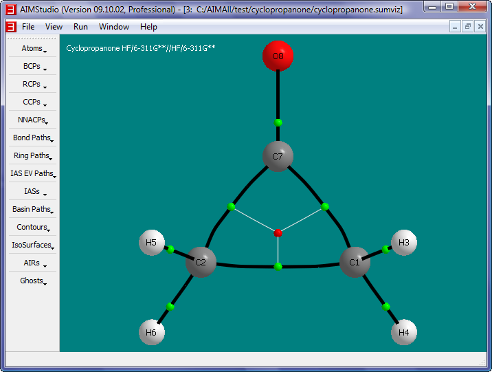 - In AIMStudio, select the menu item "File->Open in Current Window" to launch a File Open dialog and open the files c1.basviz, c2.basviz, c7.basviz and o8.basviz files that are in the C:\AIMAll\test\cyclopropanone\cyclopropanone_atomicfiles directory.