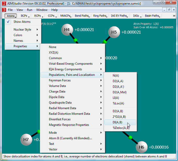 check the menu item "Atoms->Properties->Text-Placement->Bottom" so that the DI(A,B) value is shown below the BCP sphere associated with each bonded atom pair.