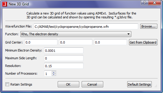 - In the "New 3D Grid" dialog, select the "Browse" button to launch a file open dialog and select the file C:\AIMAll\test\cyclopropanone\cyclopropanone.wfn. Also,