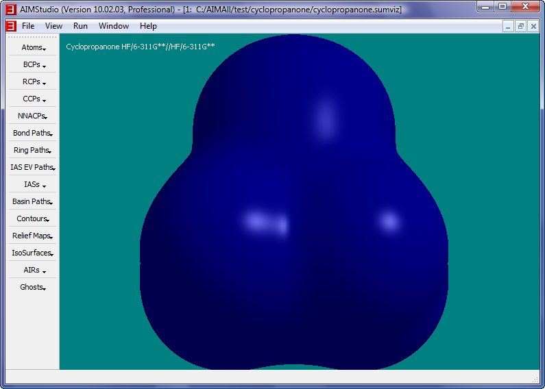 - In AIMStudio, select the menu item "File->Open in Current Window" to launch a File Open dialog and open the file C:\AIMAll\test\cyclopropanone\cyclopropanon_rho.g3dviz