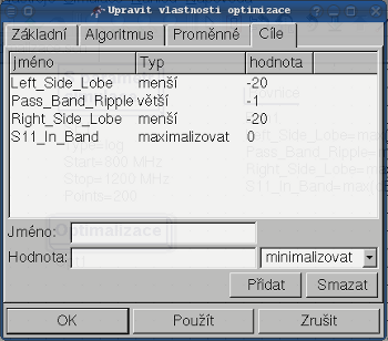 Obrázek 5 - Optimalizace - dialog, cílové možnosti.