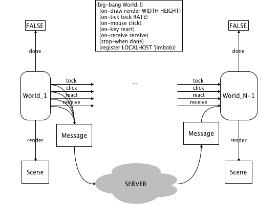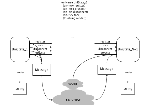 The following picture provides an intuitive overview of the workings of a world program in the form of a state transition diagram.