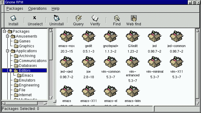 To select a single package, click on it with the left mouse button. You'll notice that highlighting will appear around the package's title (as shown in Figure 6-2). To unselect it, either click on an empty space in the display panel with the left mouse button, or click on the Unselect button on the toolbar.